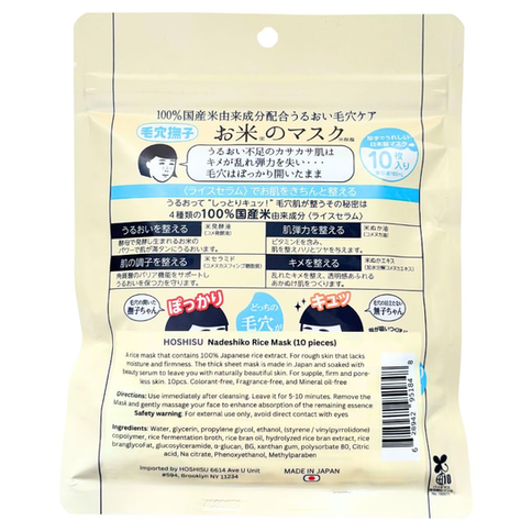 A rice mask that contains 100% Japanese rice extract. For rough skin that lacks moisture and firmness. The thick sheet mask is made in Japan and soaked with beauty serum to leave you with naturally beautiful skin. For supple, firm and pore-less skin. 10pcs. Colorant-free, Fragrance-free, and Mineral oil-free. HOSHISU brings you authentic Japanese skincare, thoughtfully repackaged and translated for North American use — with clear labeling and full compliance you can trust.